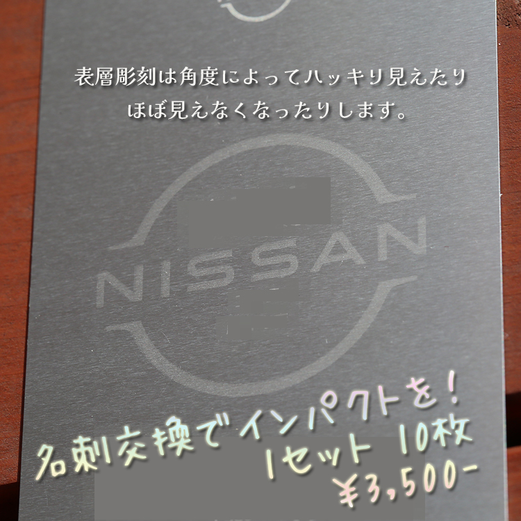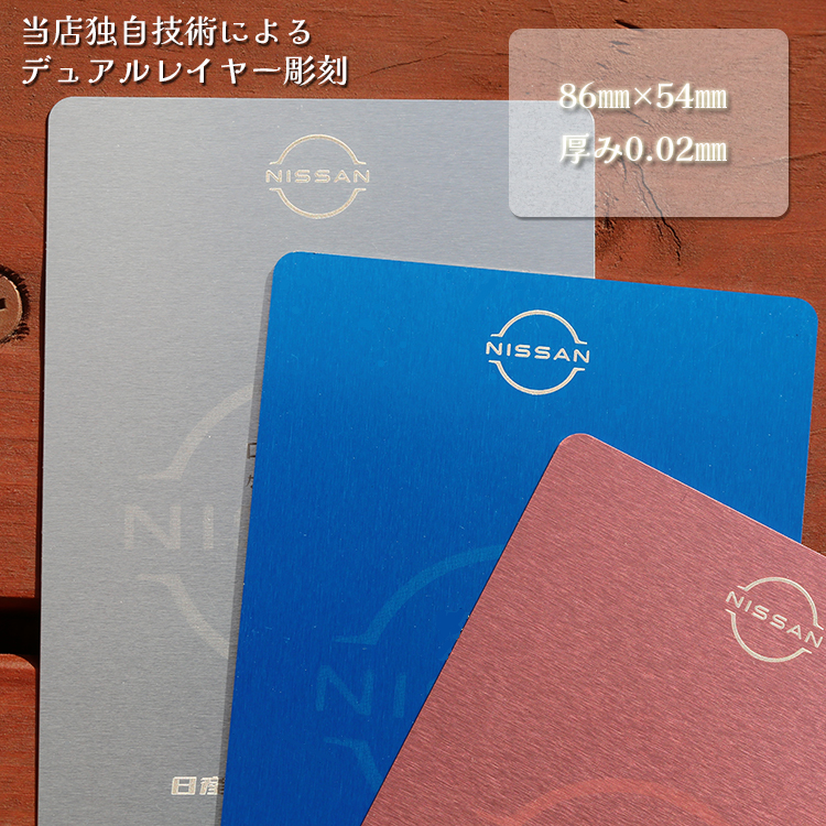 2024年2月4日☆☆販売開始。 こちらは、アルミ製の高級名刺となります。 かなり高級な名刺なのですが 10枚からの販売でお値打ちです! こちらの商品は更にオシャレな仕様となります。 実は、名入れサービスはサンキャッチャーより前から行っております。 大口注文は、お気軽にどうぞ(^^)/---------------------------------------- ご注文 ⇒ 既存名刺などをメール送付 ⇒ 当店から彫刻前データをメール送付 OKの場合 ⇒ 彫刻 ⇒ 発送 NGの場合 ⇒ データ修正して再メール送付